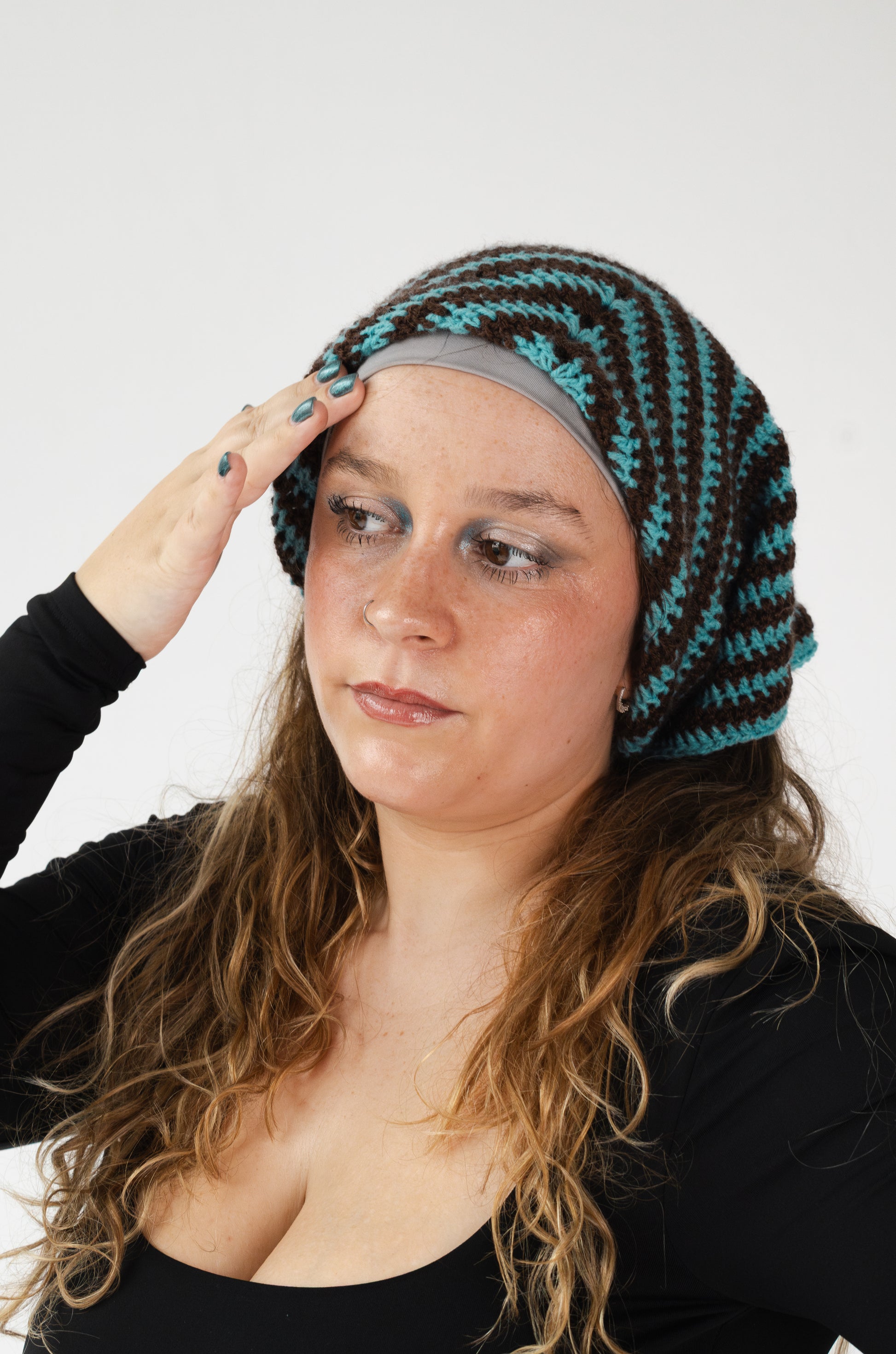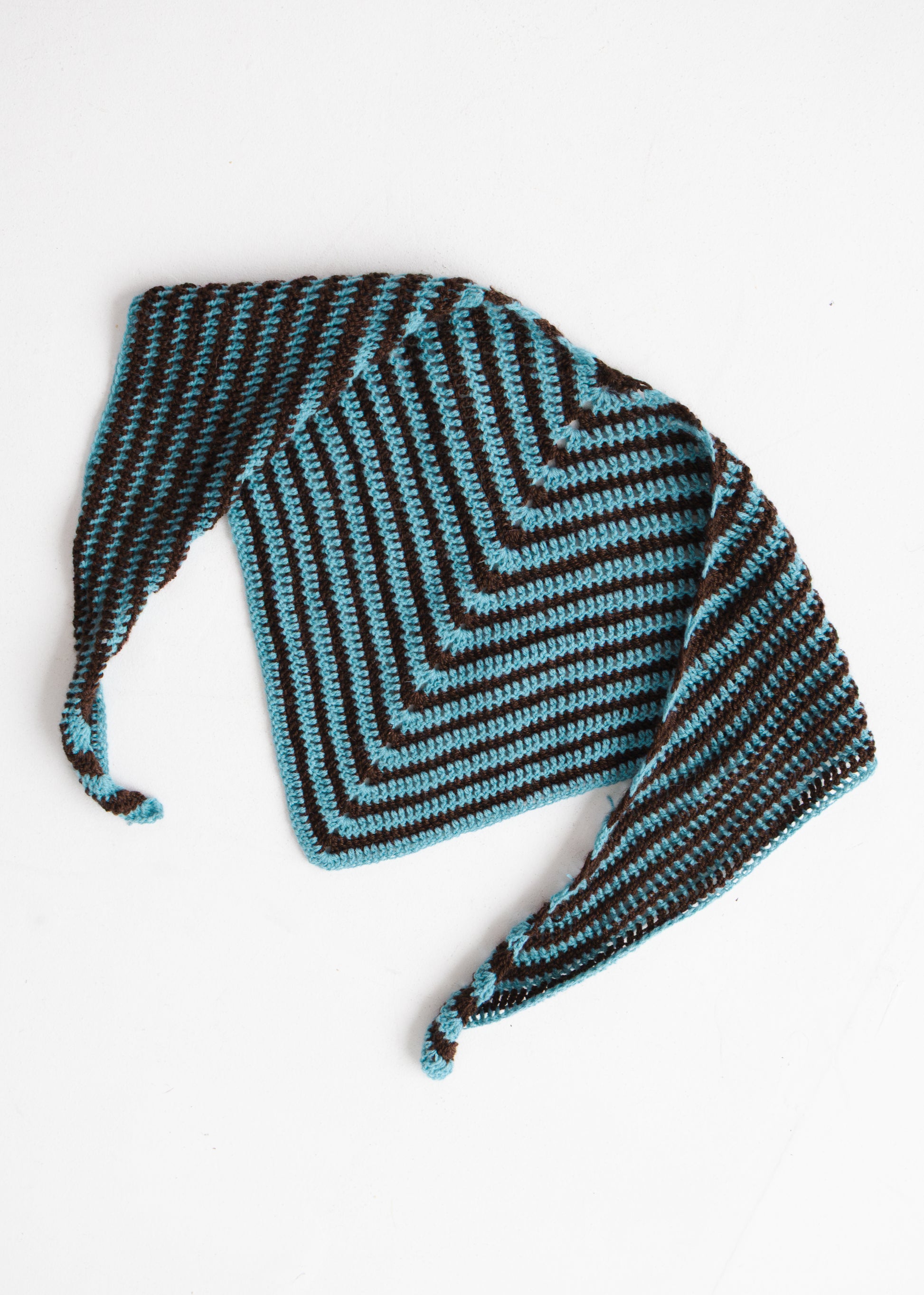 Lenço em crochet às riscas, em duas cores contrastantes, pensado para um uso rápido e direto.