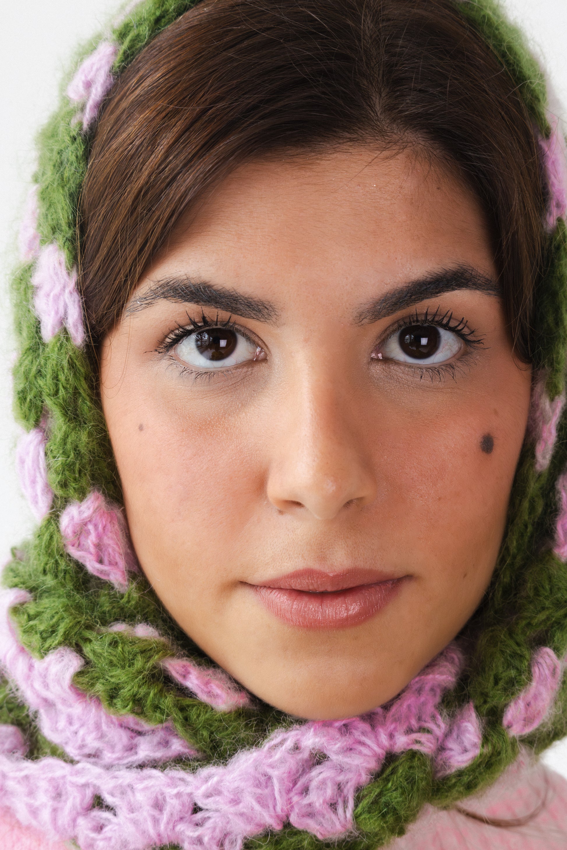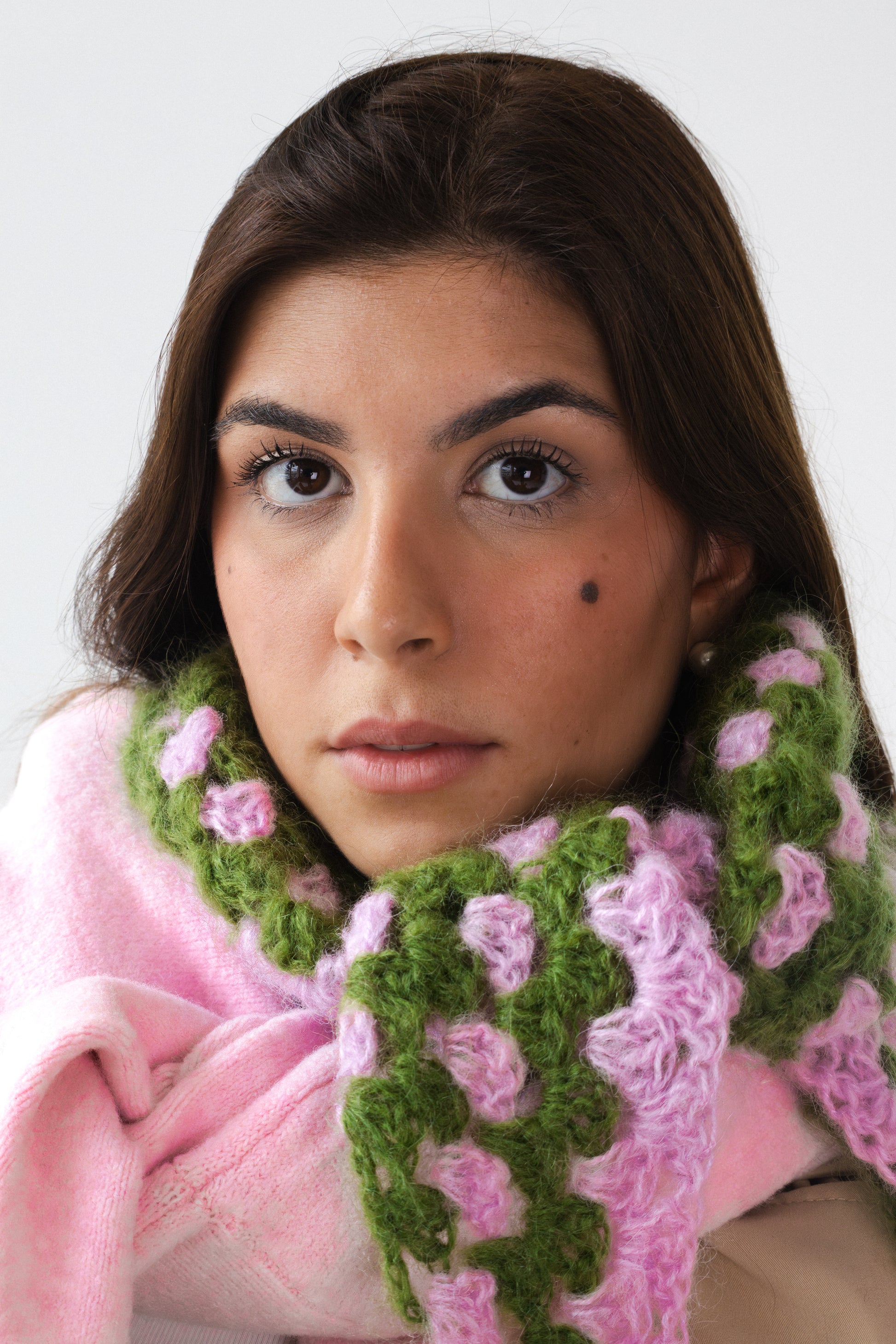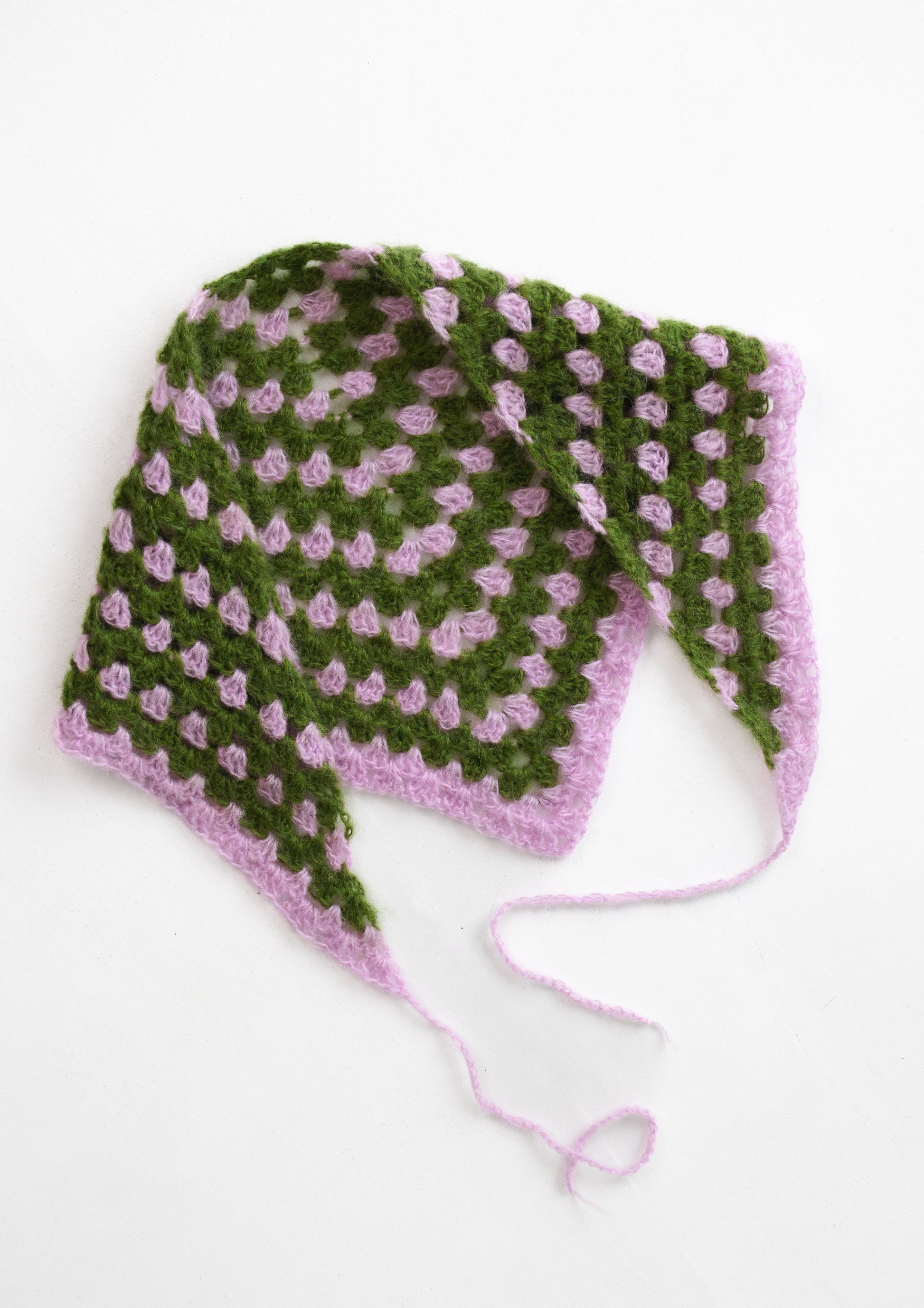 Lenço de crochet em duas cores, com padrão marcado e textura visível.