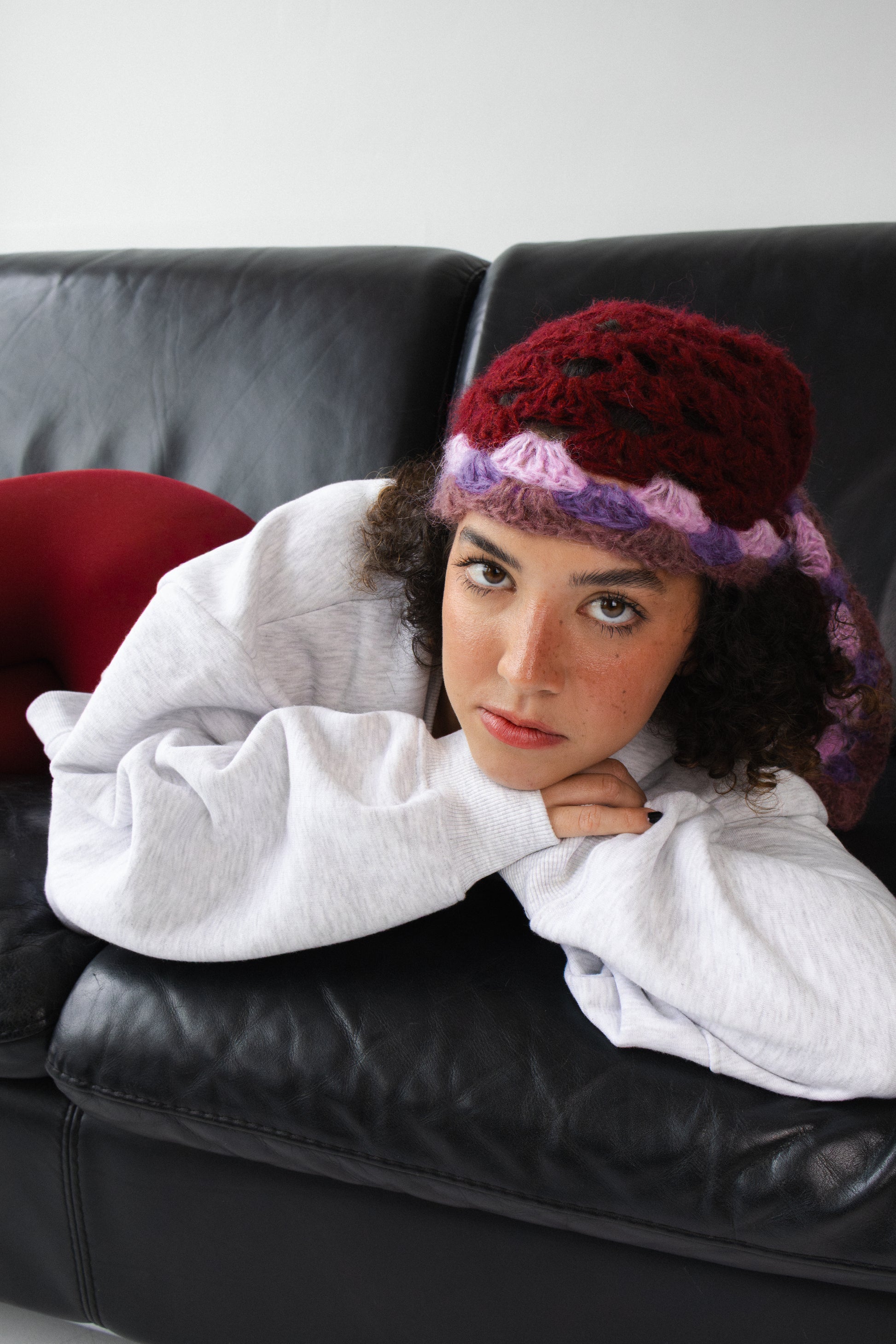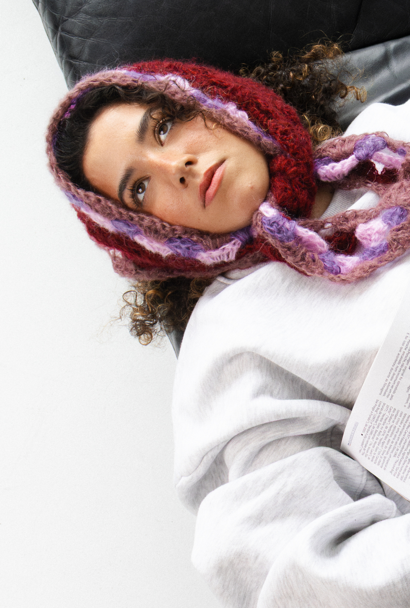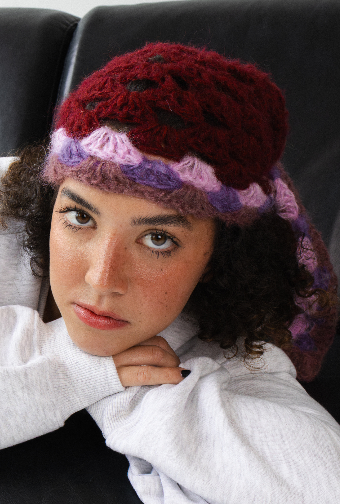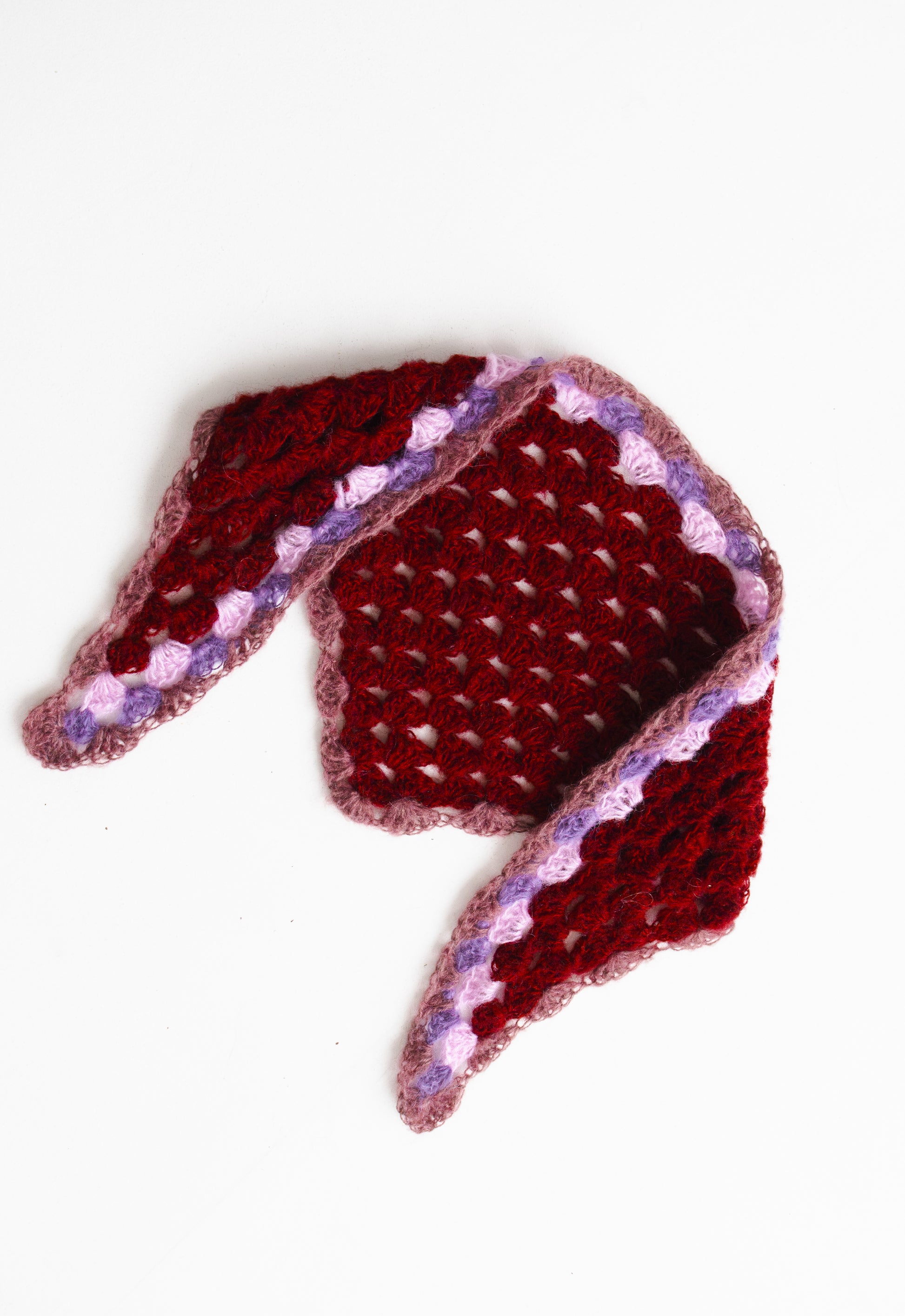 Lenço em crochet em três cores, com uma tonalidade dominante e três em contraste suave.